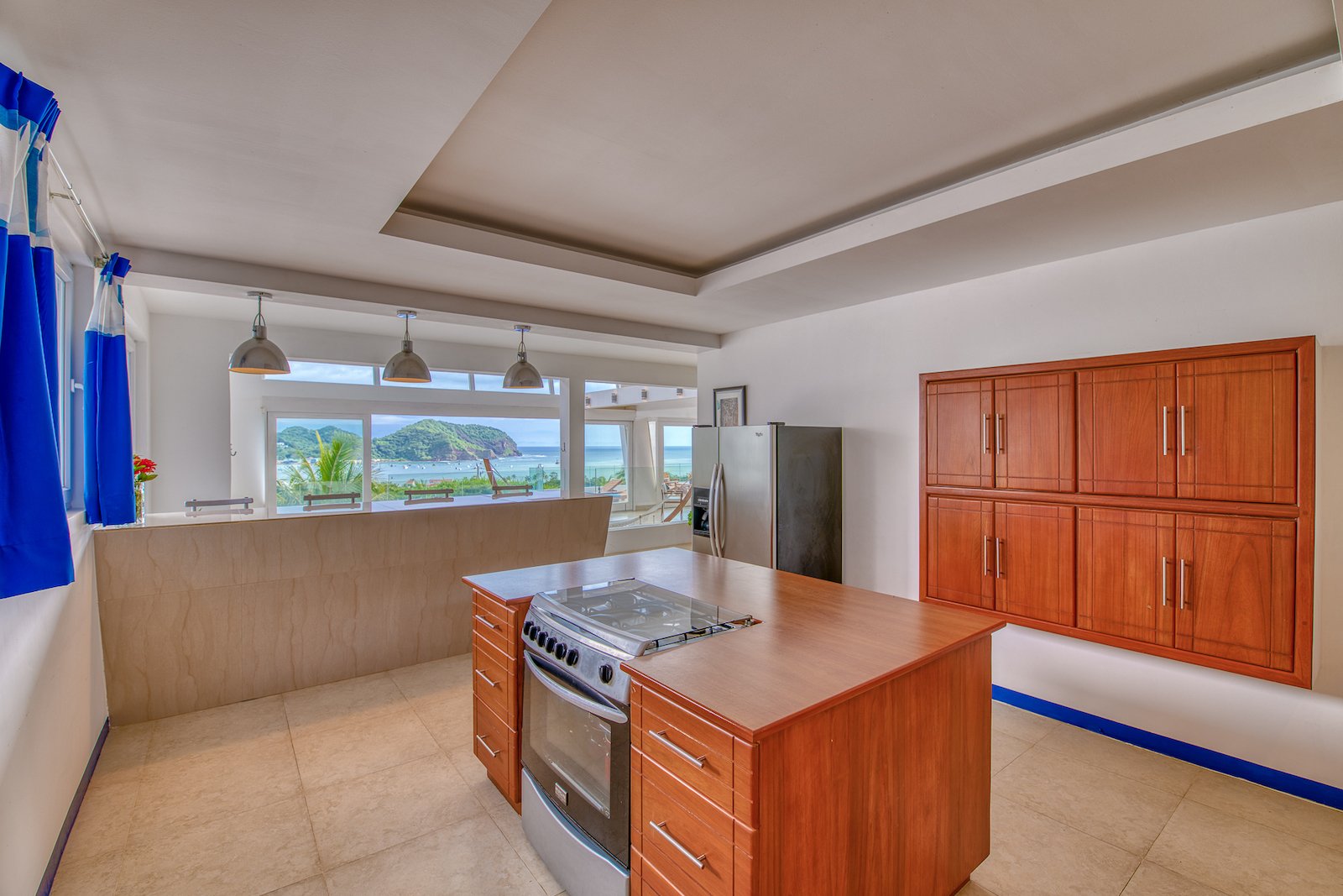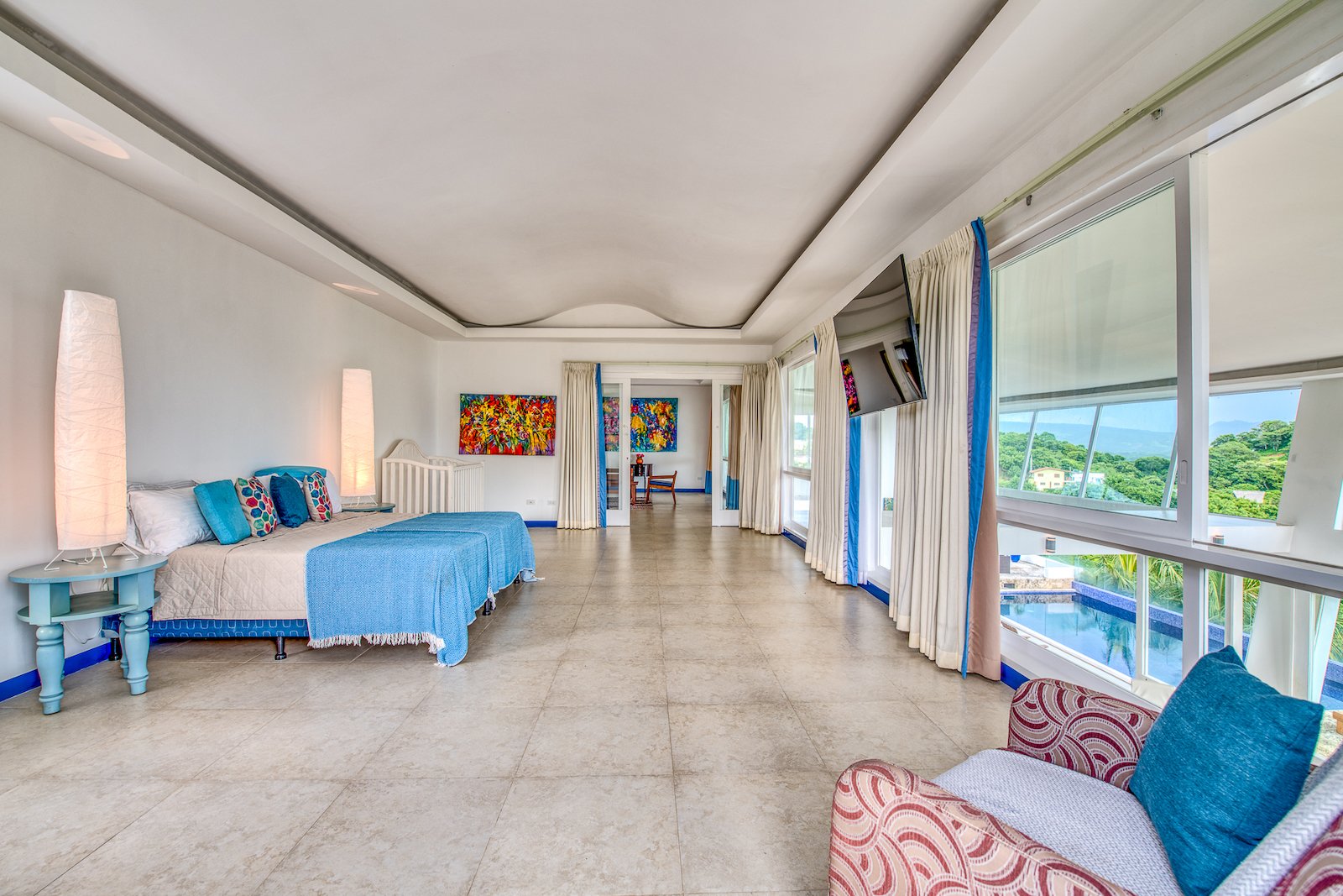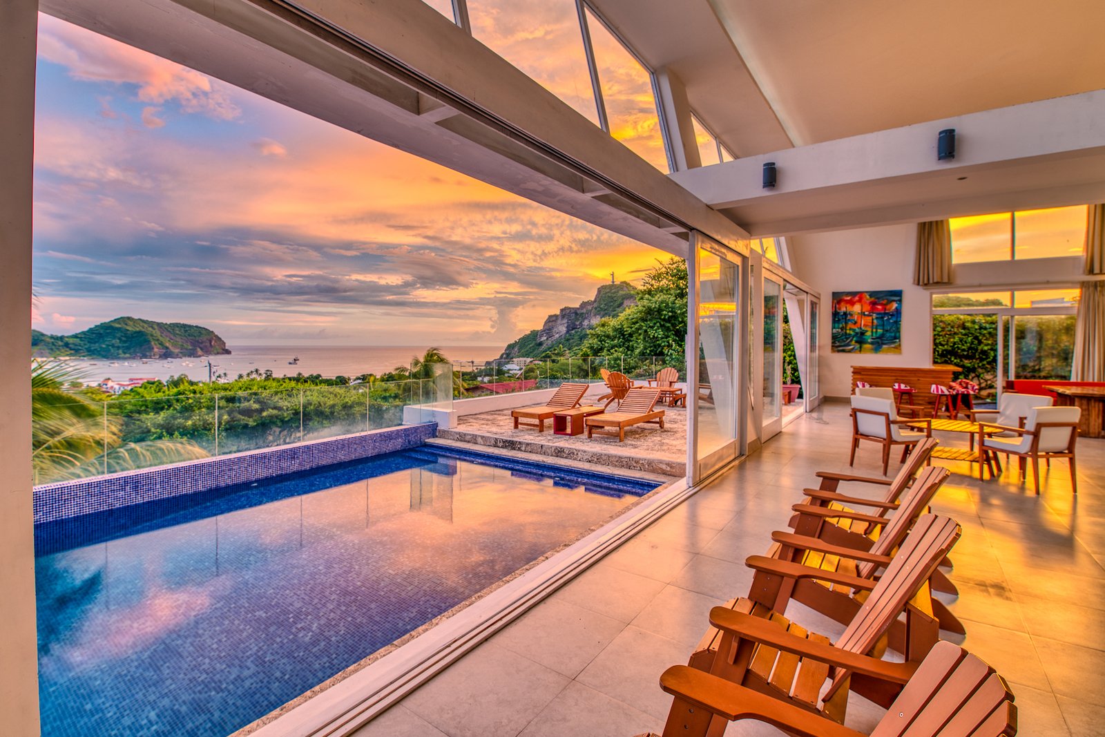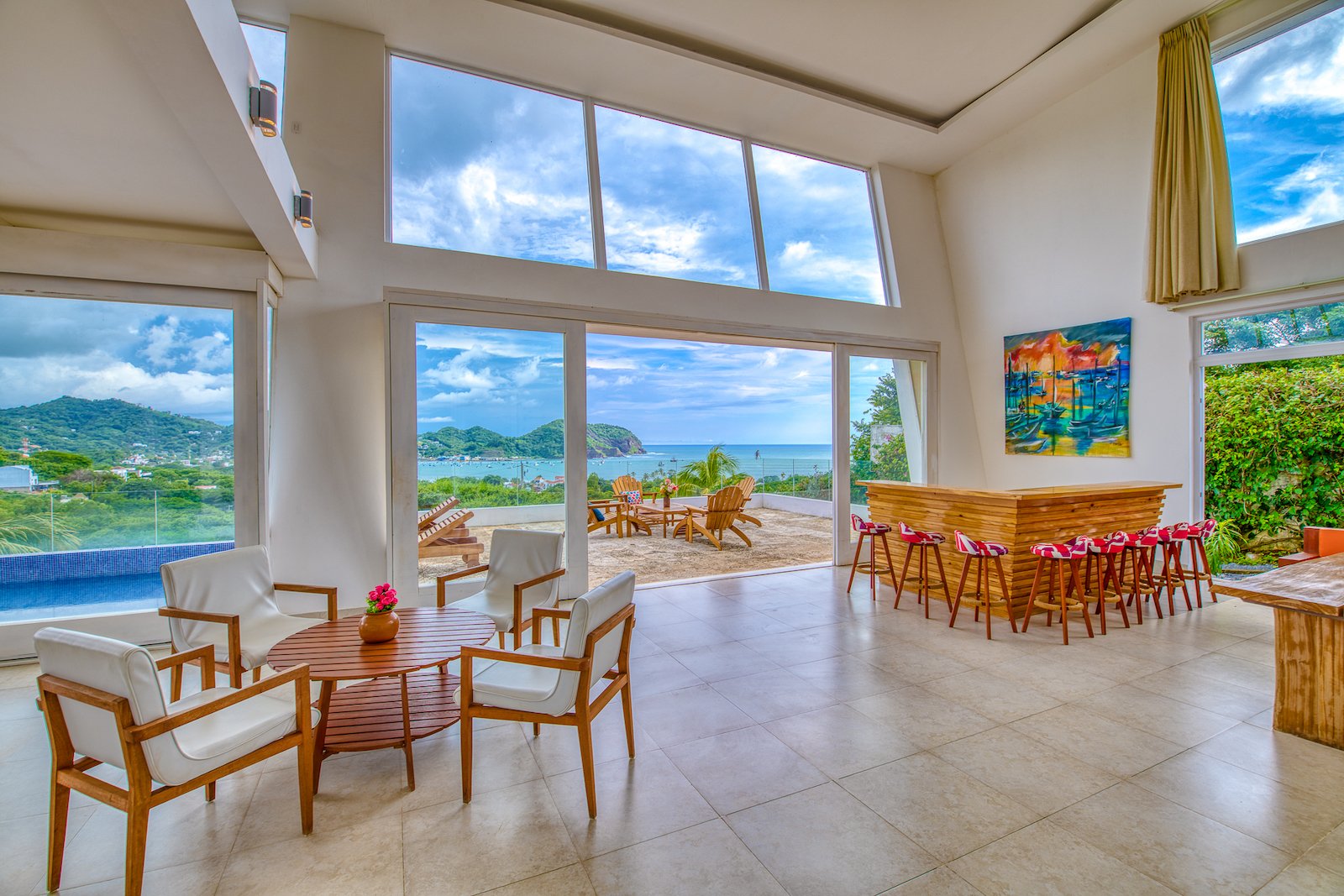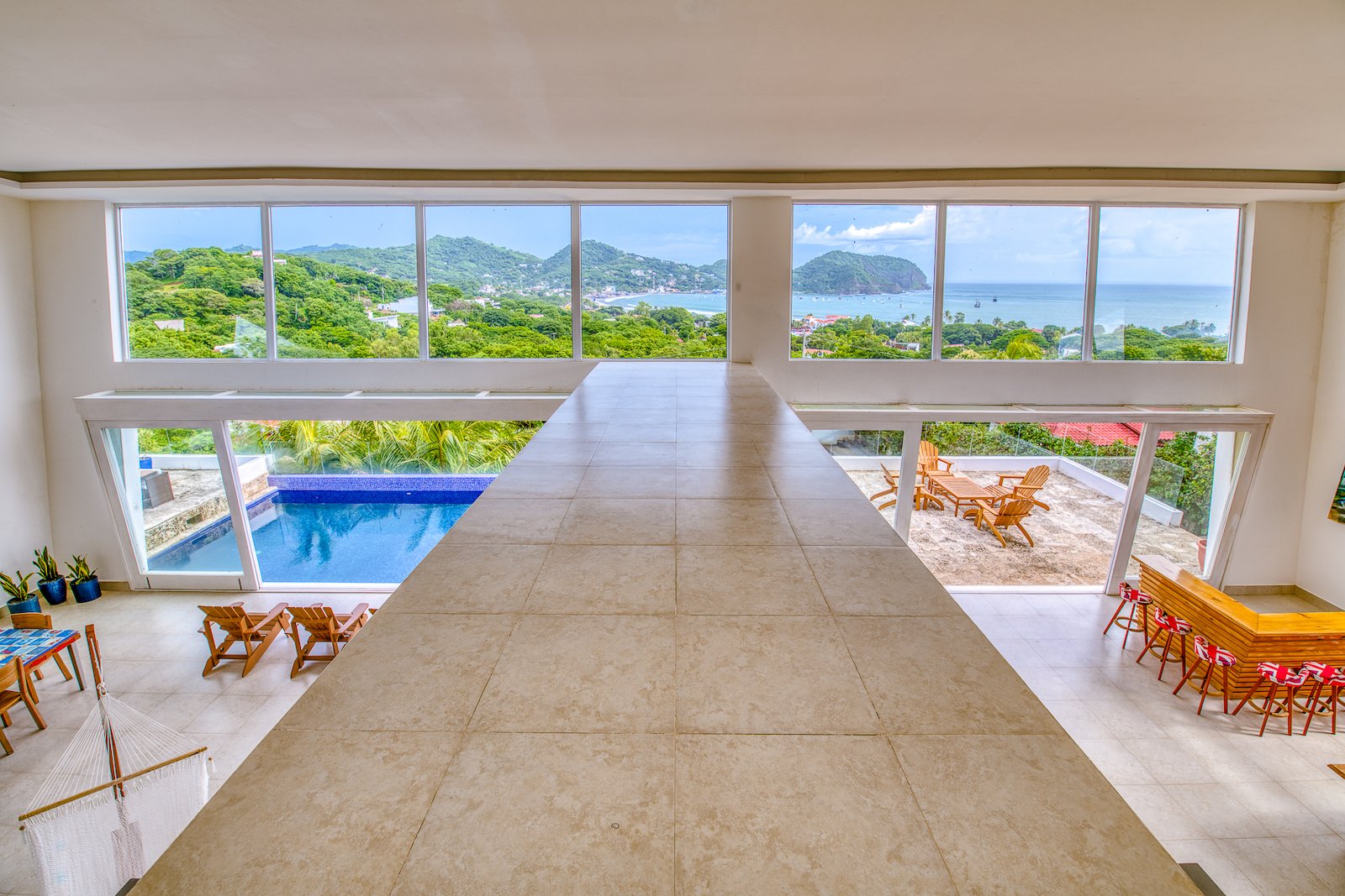 The lower level of the home has 3 bedrooms, and 2.5 bathrooms, one of the bedrooms is currently outfitted as a home office.  The kitchen and enormous open living area are also centered around the picturesque views of the ocean and mountains.  The southwest-facing side of the home has floor-to-ceiling glass windows that provide jaw-dropping views of San Juan del Sur and the ocean. Glass sliding doors open up to the coral-tiled outdoor area, with a large pool for soaking up the incredible imagery.