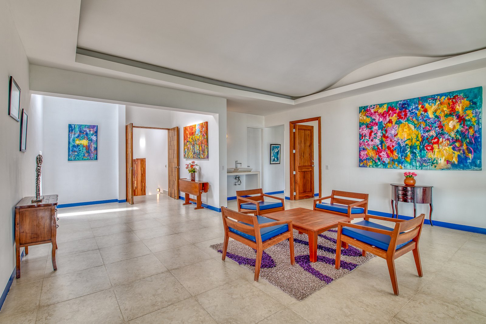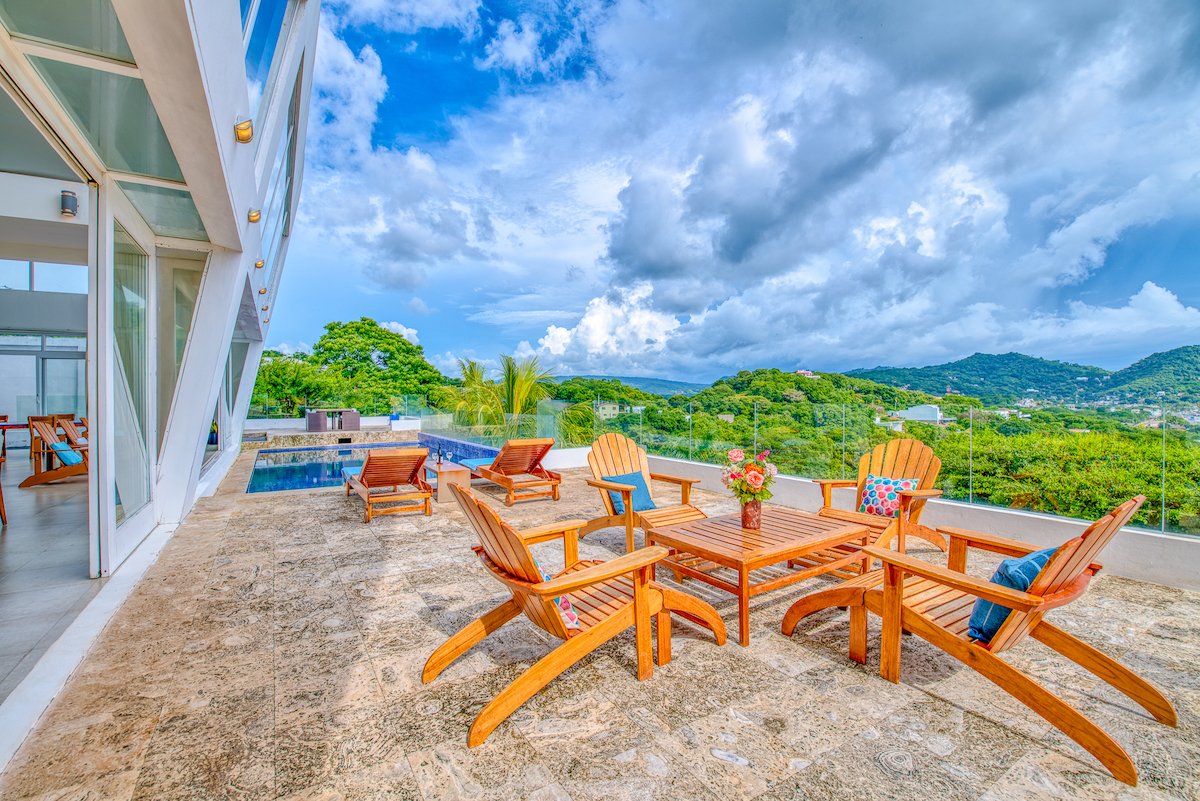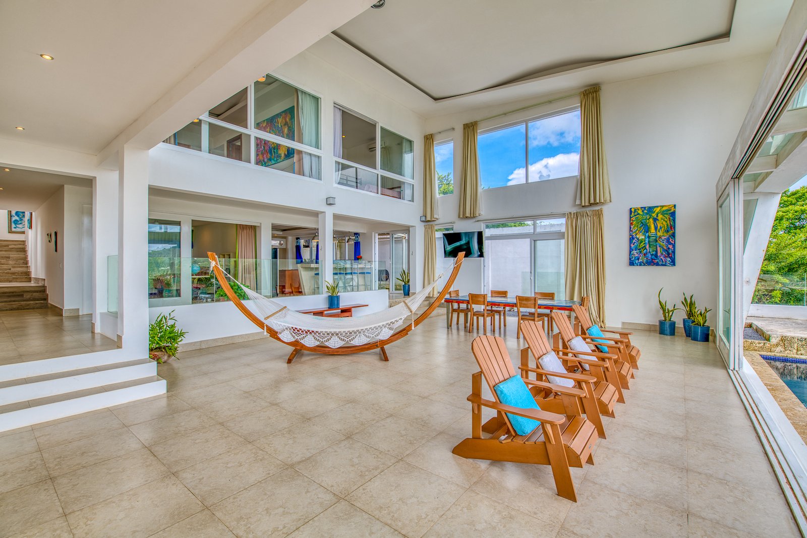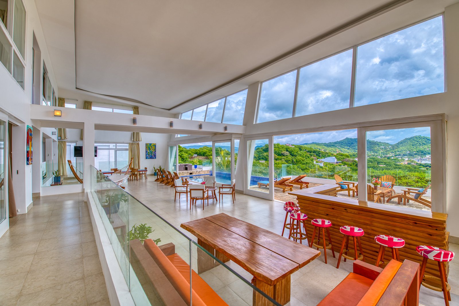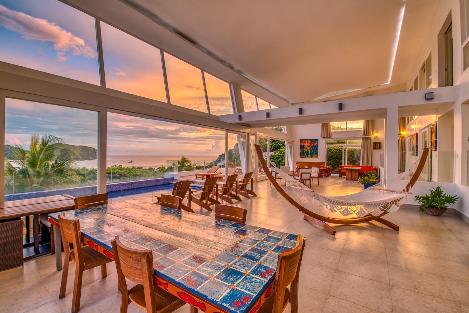 The lower level of the home has 3 bedrooms, and 2.5 bathrooms, one of the bedrooms is currently outfitted as a home office.  The kitchen and enormous open living area are also centered around the picturesque views of the ocean and mountains.  The southwest-facing side of the home has floor-to-ceiling glass windows that provide jaw-dropping views of San Juan del Sur and the ocean. Glass sliding doors open up to the coral-tiled outdoor area, with a large pool for soaking up the incredible imagery.