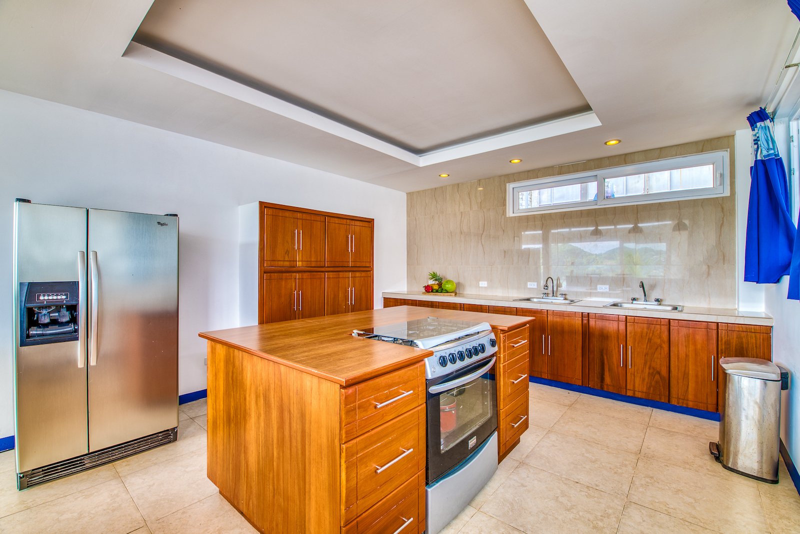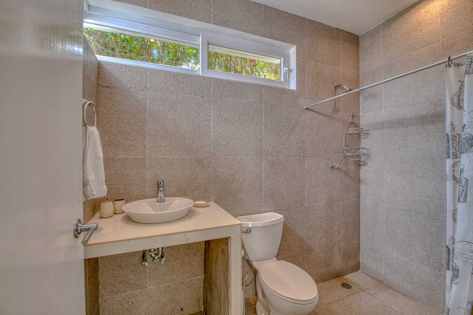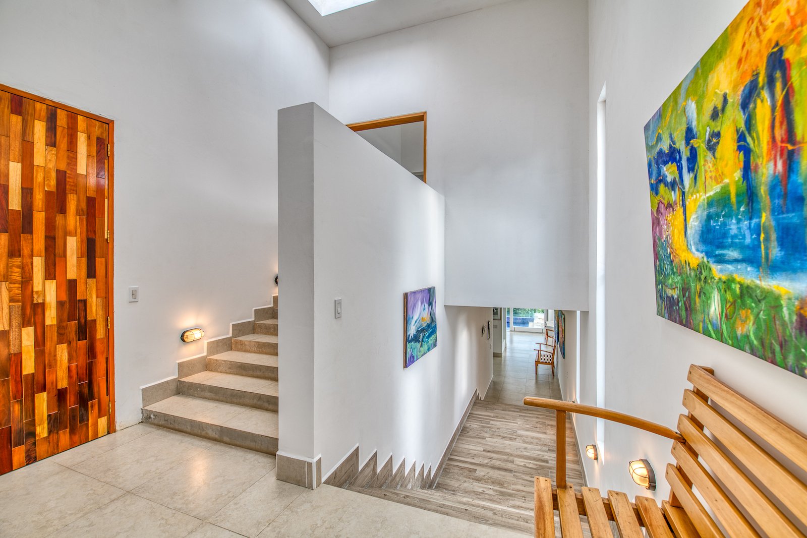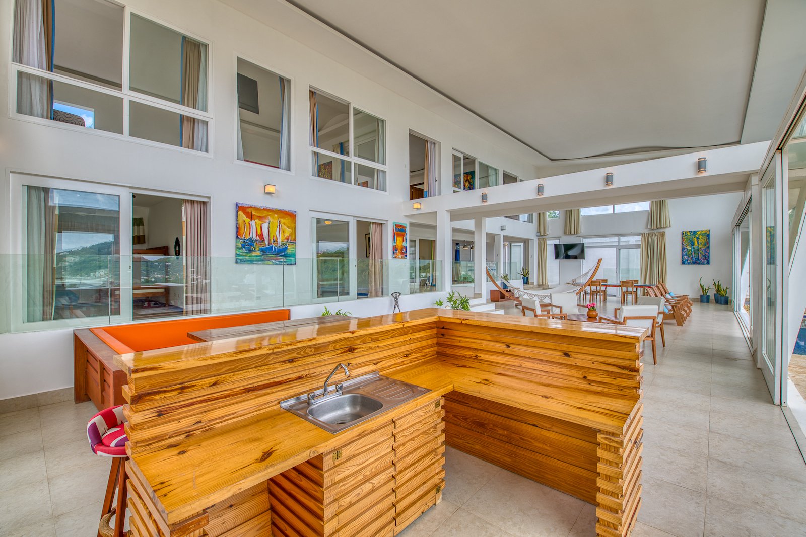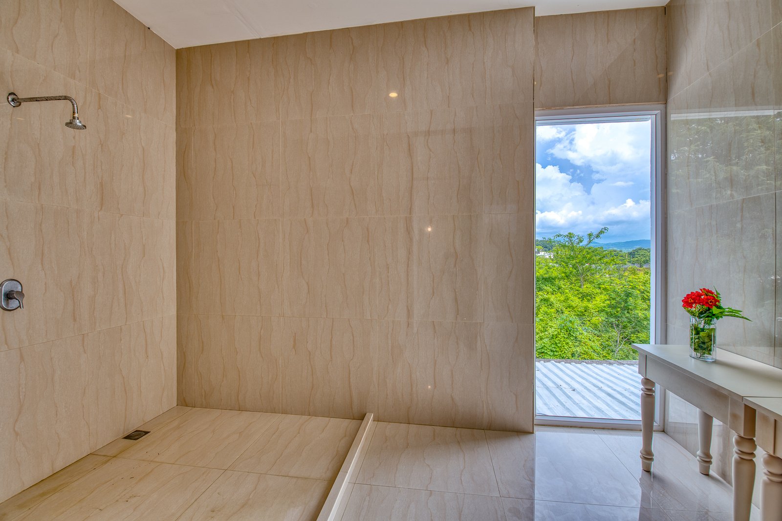 The lower level of the home has 3 bedrooms, and 2.5 bathrooms, one of the bedrooms is currently outfitted as a home office.  The kitchen and enormous open living area are also centered around the picturesque views of the ocean and mountains.  The southwest-facing side of the home has floor-to-ceiling glass windows that provide jaw-dropping views of San Juan del Sur and the ocean. Glass sliding doors open up to the coral-tiled outdoor area, with a large pool for soaking up the incredible imagery.
