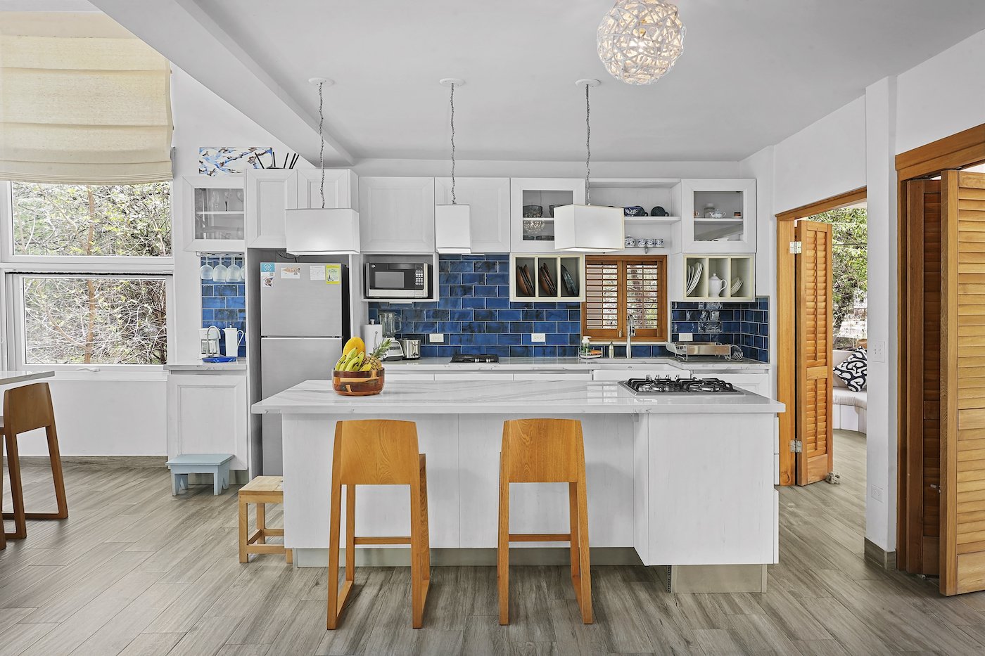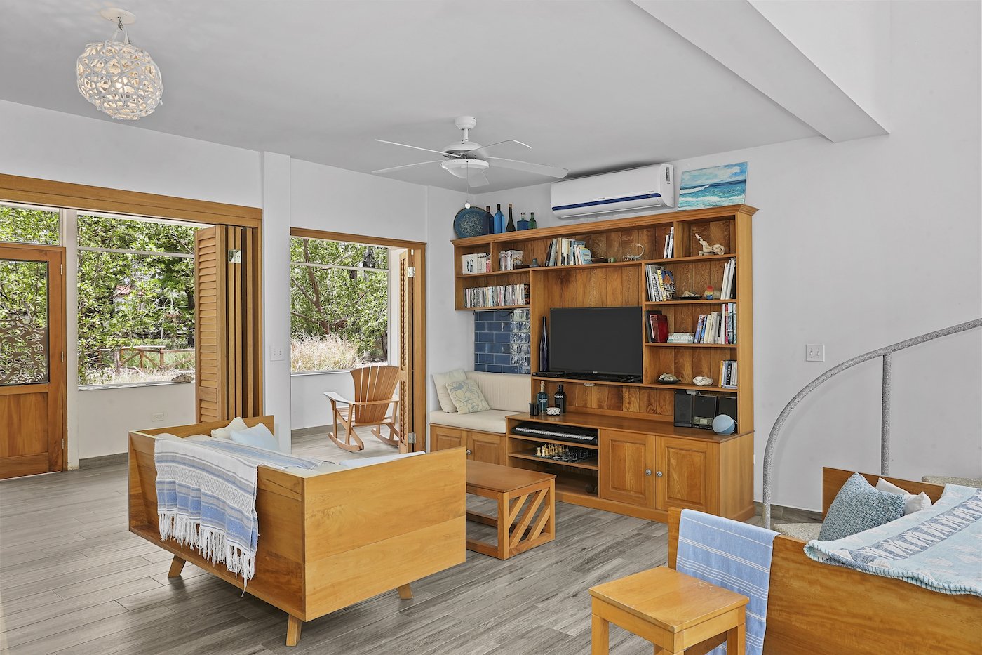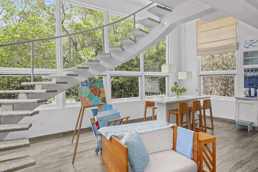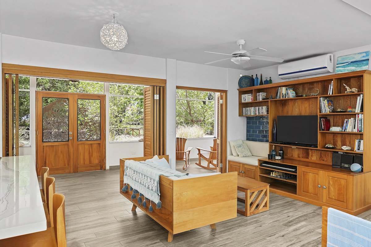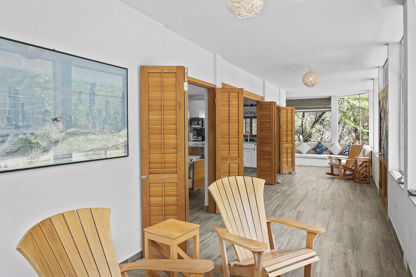 This Hacienda Iguana Beach House has all the features you would expect, including wrap-around screen porches and balconies on both levels. The vaulted ceilings and spacious windows create an open feel to the main living area, while a grand, sweeping staircase captivates your attention and adds a touch of modern luxury to the charming feel. The house is decorated with Italian quartz, handcrafted oak furniture, louvered oak doors, open showers, and natural fiber upholstery in the interior. The exterior features a sparkling pool, sand dunes in the front yard, and a natural mangrove forest in the backyard. No expense was spared in the Hacienda Iguana Beach House. The kitchen contains high-end appliances to cook up the catch of the day after a long session on the water. The high ceilings, large screen windows, and open design concept ensure that minimal to no use of the A/Cs in every room is required. Solar-powered hot water and the electrical backup system ensure that this eco-friendly home keeps you comfortable!