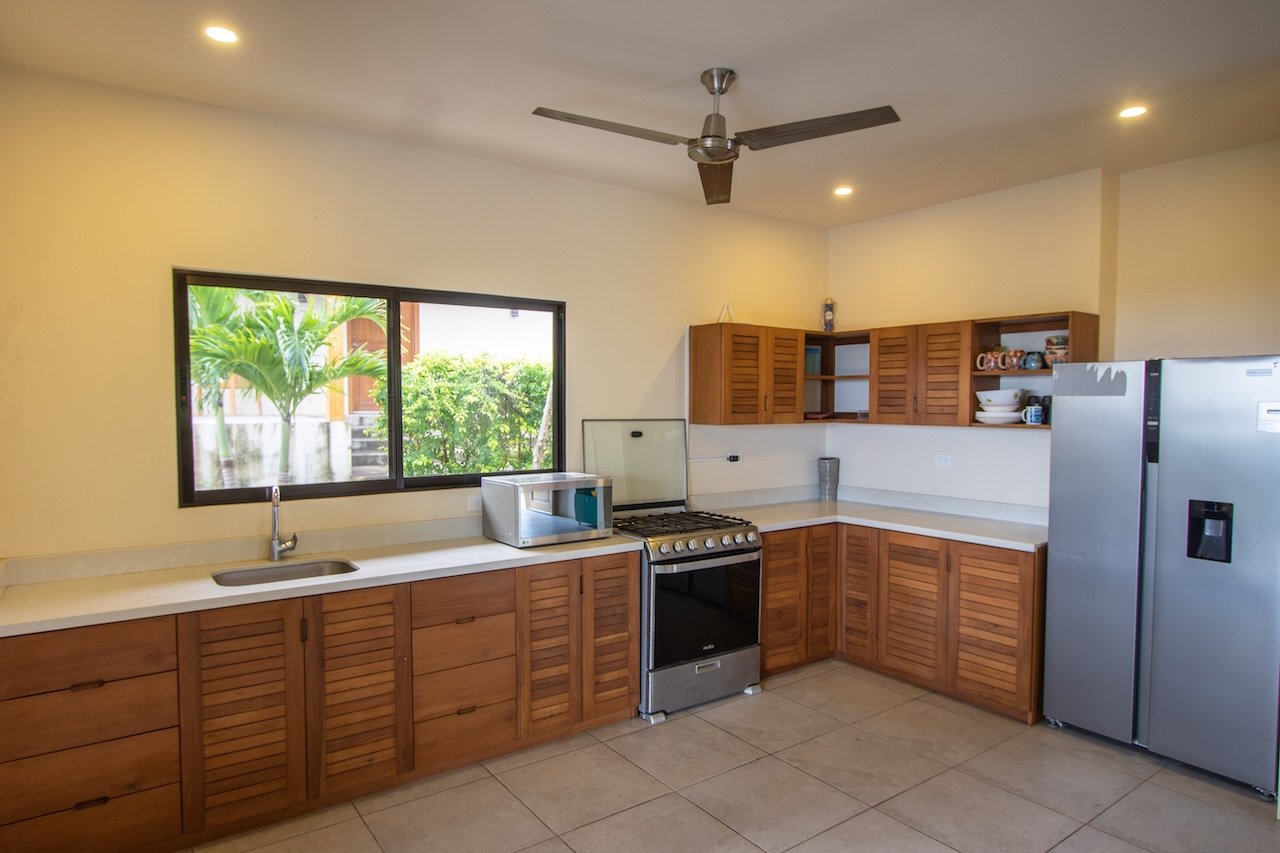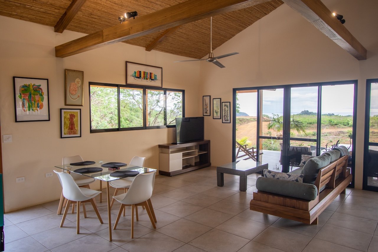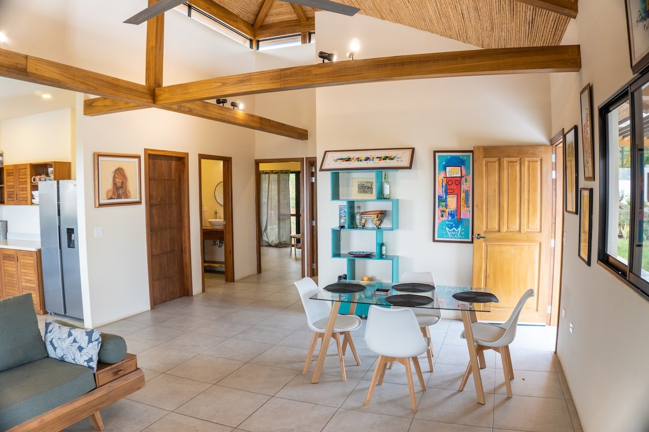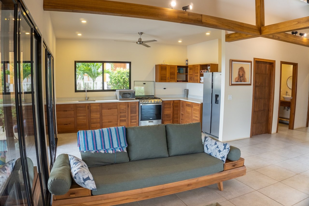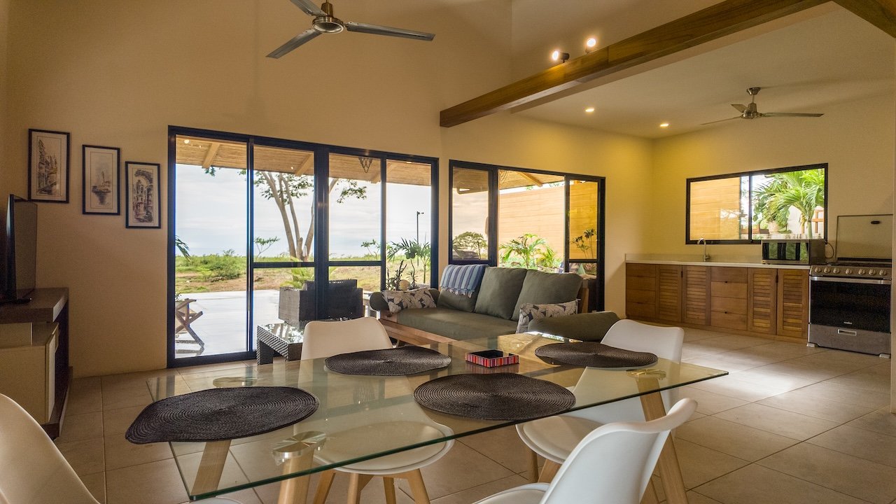 Designed to capture cooling ocean breezes and sweeping views from Costa Rica to Punta Majagual, each bungalow features floor-to-ceiling windows, an open-concept layout, and spacious decks, ideal for relaxing, entertaining, or simply soaking in the beauty of the Pacific coast. The modern kitchen, dining area, and living room flow seamlessly into the outdoor space, making it perfect for tropical living.